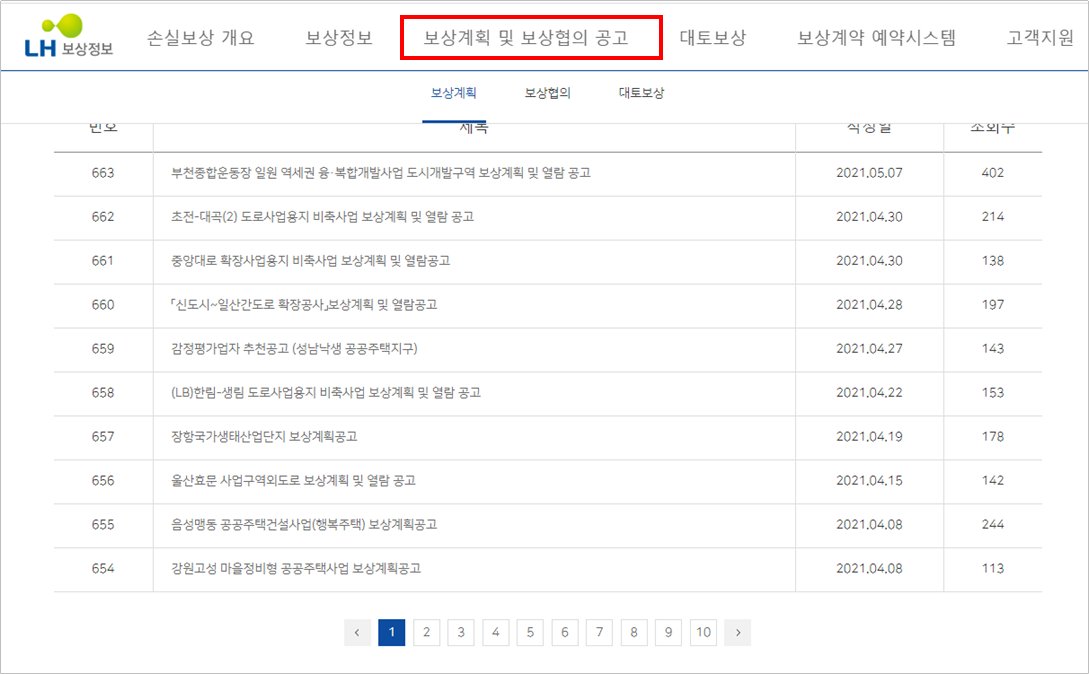 보상관련된 공고문은 보상계획 및 보상 협의 공고에서 보실 수 있습니다. 각 지역별 보상계획 열람공고가 올라오는 곳이고 이런 공고는 잘 챙겨야 하는데 모르고 있으면 보상에서 불이익이 있을 수 있으니 꼭 챙기시기 바랍니다.